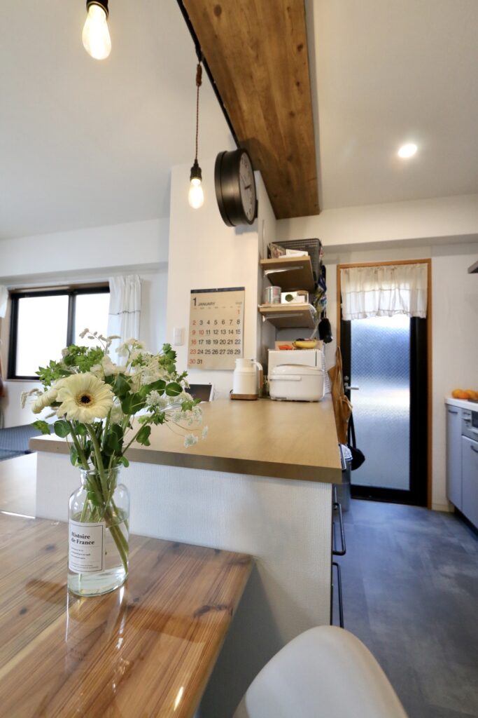 あとはリフォームに合わせて購入した新しいダイニングテーブルの高さに合わせたカウンターを作ってくれたり、使いたかったIKEAの引き出し棚に合わせて棚をつくってくれたり。キッチンの壁を取ったので、照明をどうしようか悩んでいたらレイルのライトを提案してくれて「それだ!」って笑。