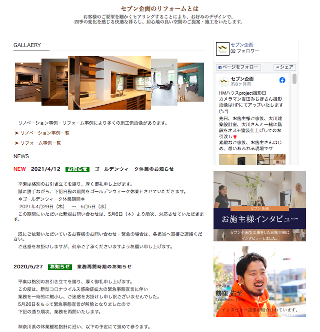 自社HPの充実は多くのリフォーム会社様の課題です。特に完成事例の更新はMUST事項です。エンドユーザーは現調依頼をする前に必ずその会社のHPを閲覧します。情報が頻度高く更新されている、現在もきちんと稼働していることがわかる会社には安心して問い合わせをすることができます。当サイトではお施主様インタビューの撮影取材を定期的に実施。お知らせ欄に貴社HPに“動いている感”を提供します。