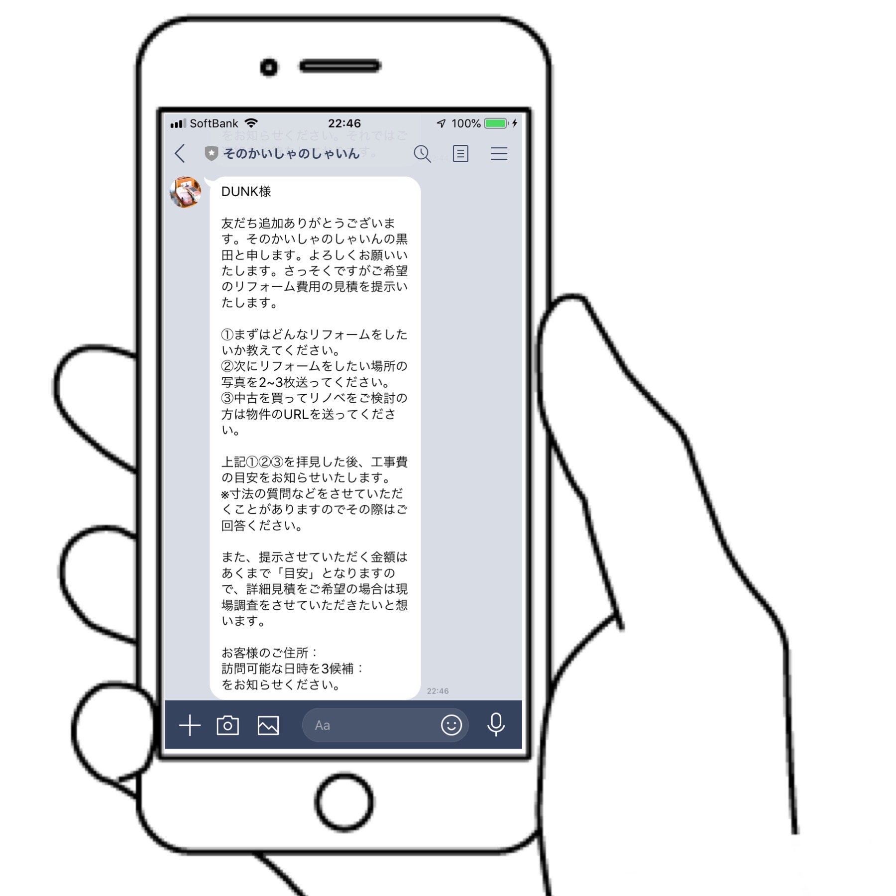 この手順でLINE公式アカウントを友だち追加すれば、すぐに相談の準備が完了します。個人情報の入力は不要で、トーク画面からリフォームの相談を開始できます。
